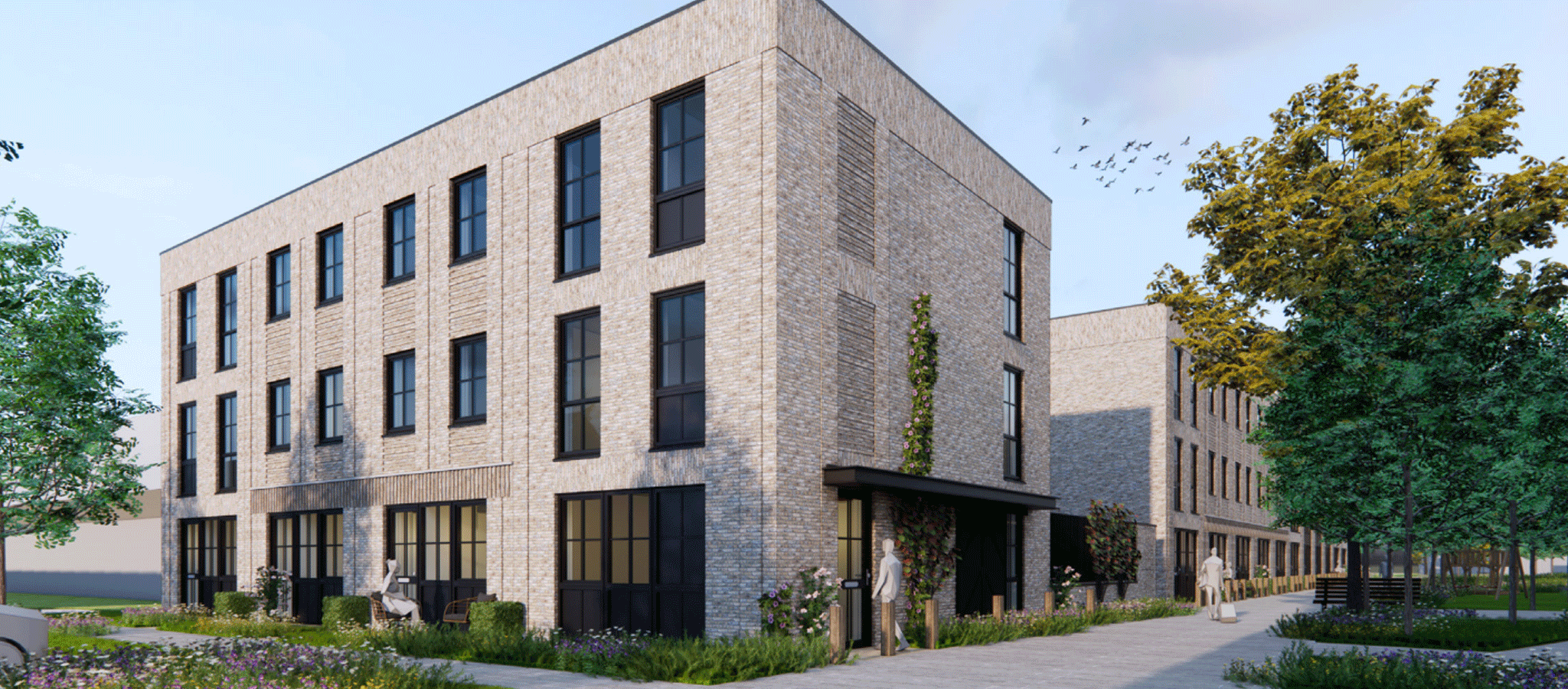 Na het concept stedenbouwkundig plan van Nieuw Houtwijk is het tijd voor het eerste schetsbeeld van de woningen. Deze schets geeft je een beeld van de architectuur en de sfeer van de wijk. De woningen in Nieuw Houtwijk krijgen een stoere, industriële look die doet denken aan de historie van de locatie.